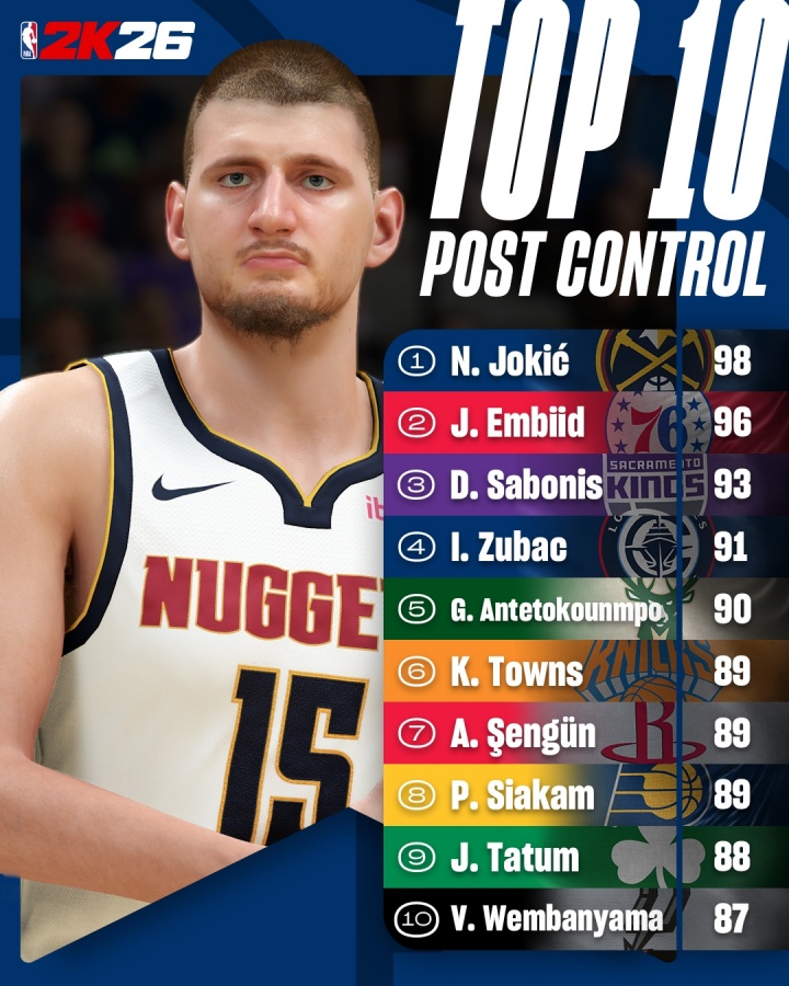 NBA2K低位背打能力排行榜TOP10揭晓:榜首 约基奇 98分榜眼 恩比德 96分探花 小萨博尼斯 93分第四名 祖巴茨 91分第五名 字母哥 90分第六名 唐斯 89分并列第七 申京 89分并列第七 西亚卡姆 89分第九名 塔图姆 88分第十名 文班亚马 87分...