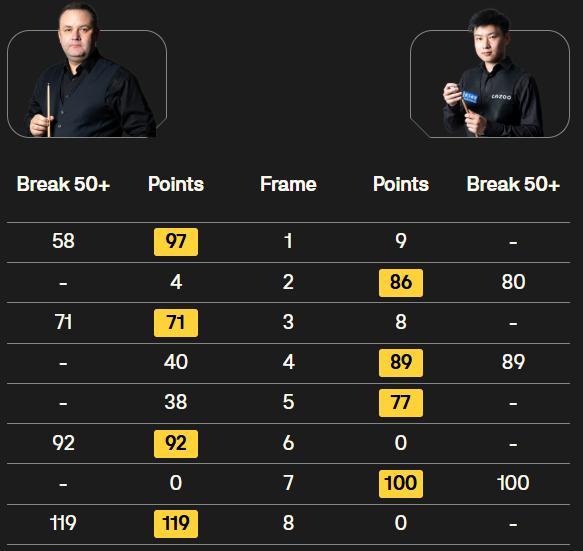 直播吧08月26日讯 2025斯诺克武汉公开赛,32进16轮次,中国选手赵心童对阵苏格兰选手斯蒂芬-马奎尔。经过9局鏖战,赵心童4-5负于马奎尔,止步武汉公开赛32强。斯蒂芬-马奎尔打出一杆破百(119)和三杆50+(58、71、92),赵心童打出一杆破百(100)和两杆50+(80、89...